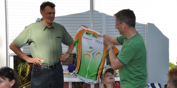 ... und demnächst dann auch der Bericht. Das wichtigste: alle sind geund angekommen, Team Radar 1 hat in der Firmenwertung den 7. Platz belegt und ohne Ciuppis Reifenpanne könnten wir noch weiter vorn liegen, daran arbeiten wir das nächste Jahr ... Team 3 hat den 26. Platz belegt, Team 2 den 28. Auch daran arbeiten wir für das nächste Jahr. Aber bei wahnsinnig gutem Wetter war das wieder ein ganz tolles Rennen. Wir hoffen bei den Stürzen sind alle glimpflich davon gekommen, besonders der Kollege gleich am Anfang desRennens hinter Tiefenbrunn der uns die Sorgenfalten auf die Stirn brachte. Auf jeden Fall gute Besserung. Kleine Geschichten am Rande gabe es viele, die wir ausgiebig beim "Schützenkönig" Udo (dem Teamschnellsten vom letzten Jahr) bei Weizen, Grillgut und Salat- und Kuchenbuffet auf den Tisch brachten. Olaf Busse bekam als Team-Schnellster das Siegertrikot überreicht. Einziger Kritikpunkt: Es wäre schön wenn es nächstes Jahr nicht ganz so beengt im Zielbereich zugehen würde. Die Idee, die Transponder-Abgabe auch noch stadtseitig unterzubringen war nicht unbedingt die Beste und ein vollkommen überforderter Bierpils für über 2000 durstige Radler ist uns jedes Jahr wieder ein Rätsel. Denn ein Siegerbier soll uns doch gegönnt sein ... Von diesen Kleinigkeiten mal abgesehen alledings ein große Dankeschön an das Organisationsteam, das eine oder andere ist natürlich nicht immer perfekt, aber so eine Herausforderung wie die Tour d'énergie will erst mal gestemmt werden und das hat dieses Jahr doch wieder geklappt. Es war ein Super-Rennen, das Wetter war wieder perfekt und wir freuen uns schon auf nächstes Jahr!
